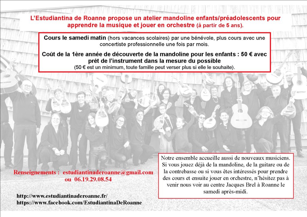 Nous proposons pour les enfants à partir de 5 ans un apprentissage de la mandoline et du solfège le samedi matin ainsi qu’un travail une fois par mois avec Natalia Korsak (mandoliniste concertiste).